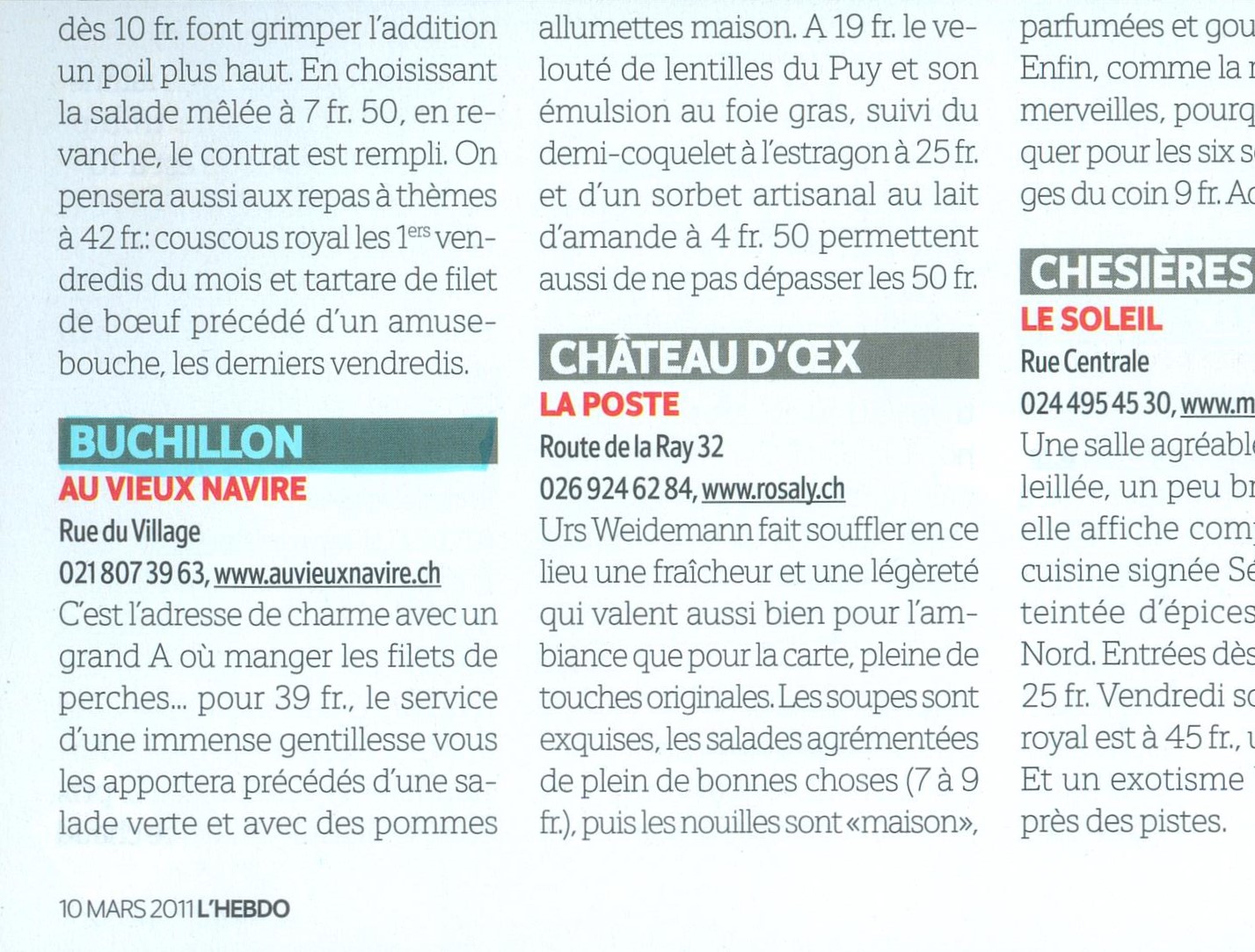 Accueil » L’Hebdo – Les meilleurs restaurants de Suisse Romande à moins de 100.- – Mars 2011